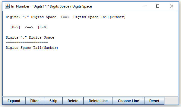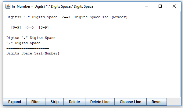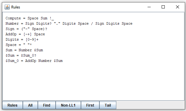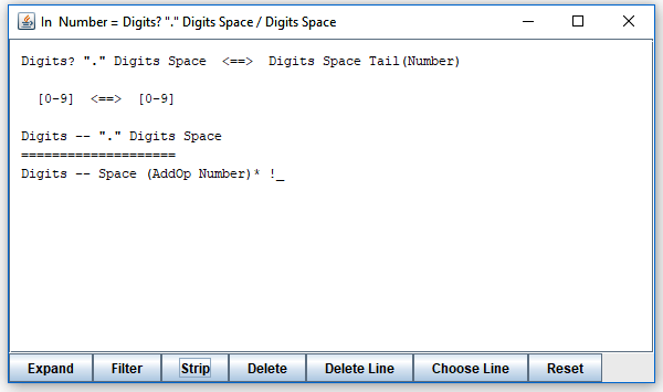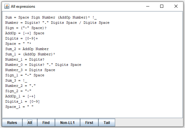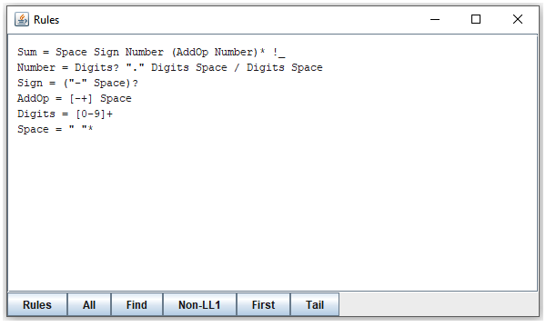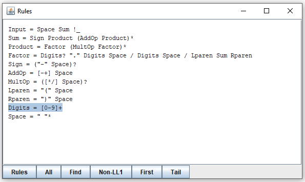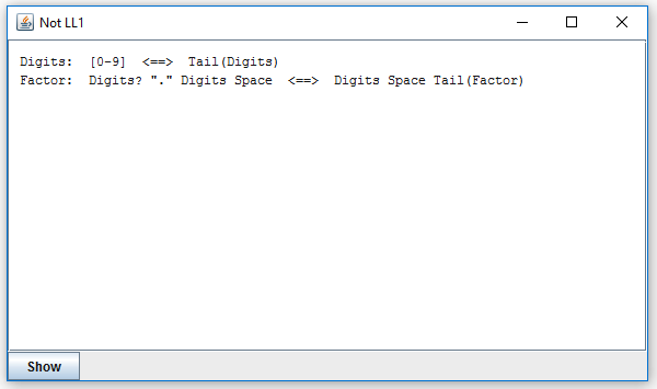 It tells you that the choice in "Number" does not satisfy LL(1). Which is rather obvious since both alternatives may start with "Digits". To explore it, click on the line. Or select the line and click the "Show" button. The result is a new window that looks like this: