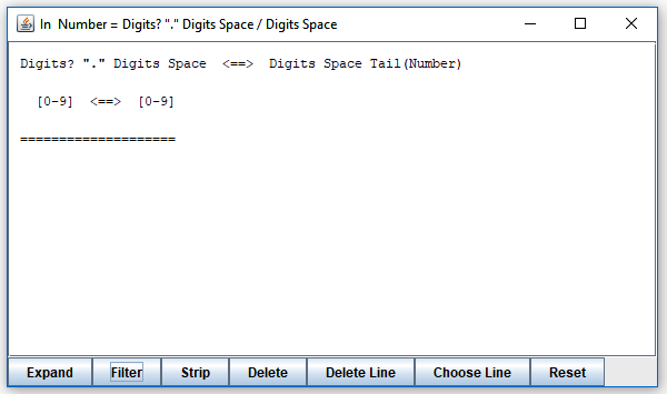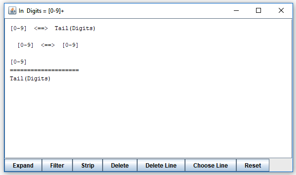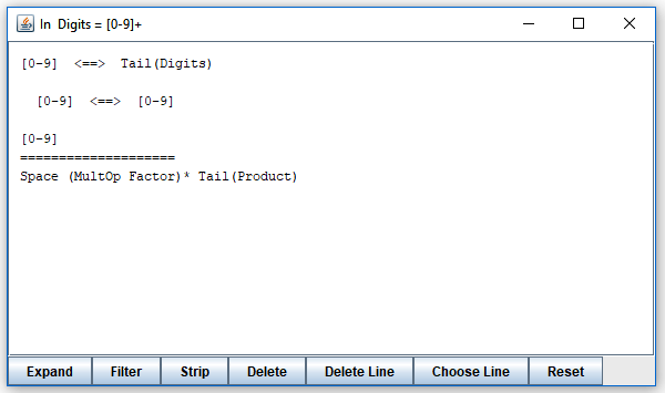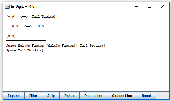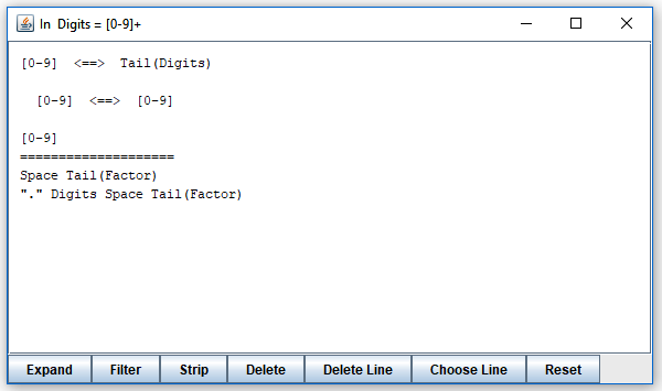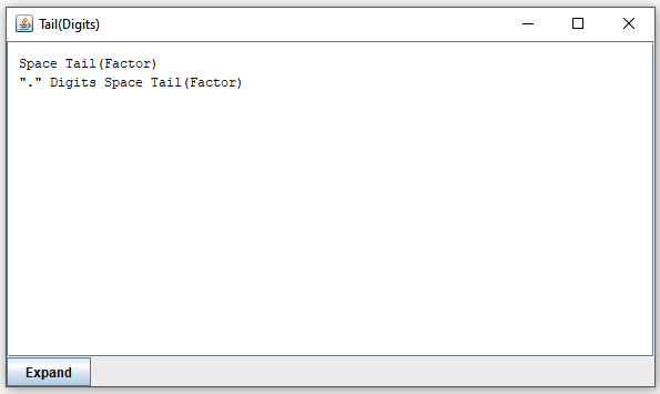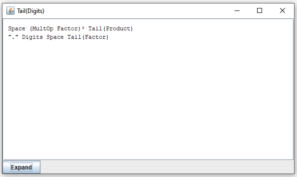 It shows what can follow after "Digits" when it is invoked in three different contexts. (As you can see, "Digits" is invoked in three different places, all from "Factor".) You can expand elements of the lines you see by clicking on them, or selecting and pressing the "Expand" button. By clicking on "Tail(Factor)" in the first line, you obtain this: