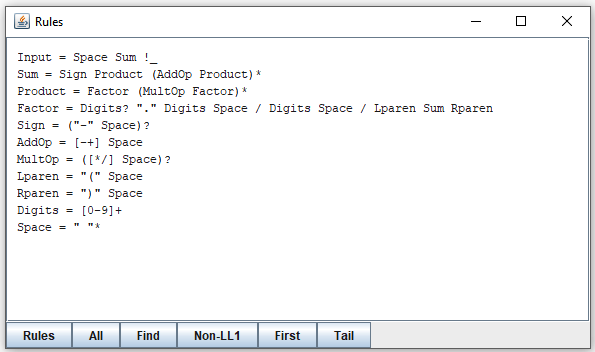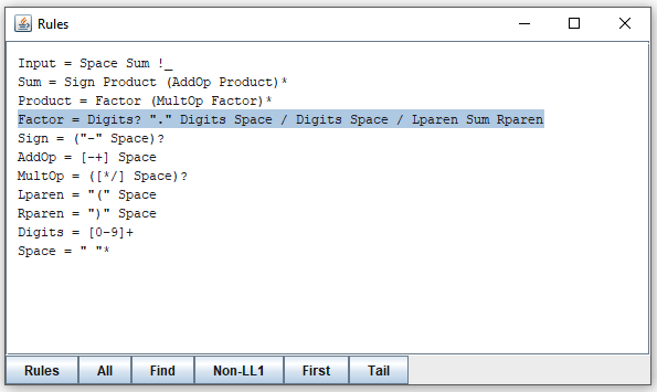 You can now close the window, which brings you back the the "Not LL1" window, and explore the other case shown there. It boils down the the same problem: the ambiguity when a multiplication operator between two Factors is the empty string.