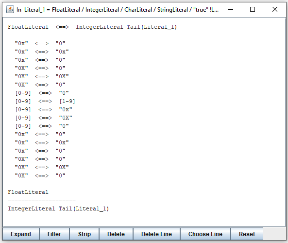 It comes from one of the sample Java grammars. You can see here that, for example, a string in "FloatLiteral" may start with [0-9] which the parser may confuse with "0x" that starts a string in "IntegerLiteral". You may decide to examine only the strings starting with exactly these terminals. To do this, you click on the line [0-9] <==> "0x". It changes the window as follows: