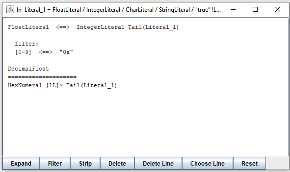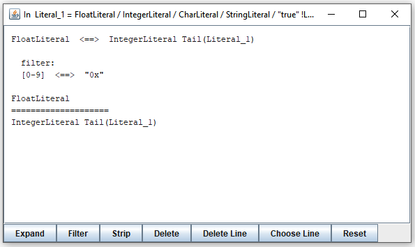 From this moment on, expressions not containing strings starting with selected terminals will be filtered out. For example, two steps in expanding "FloatLiteral" and "IntegerLiteral" will look like this:
