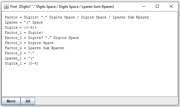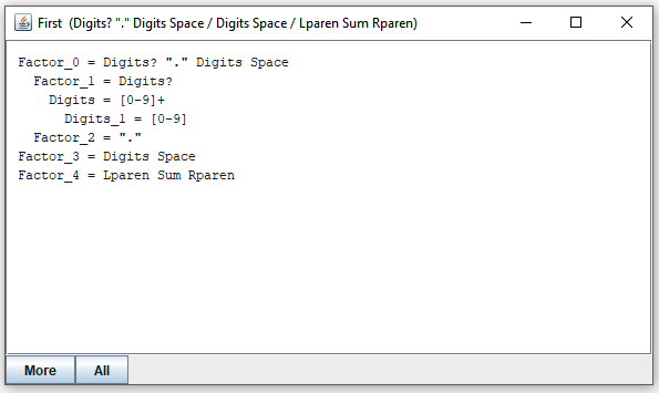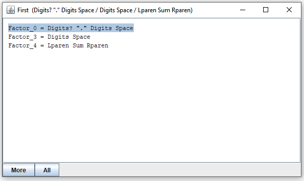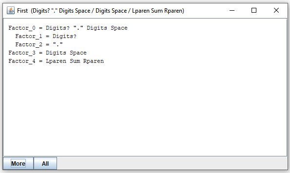 Suppose you have selected "Factor". By clicking on the "First" button, you open a new window that shows the expressions that "Factor" may call to consume the first portion of its input: