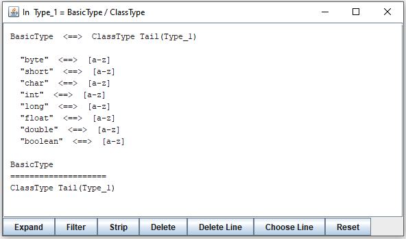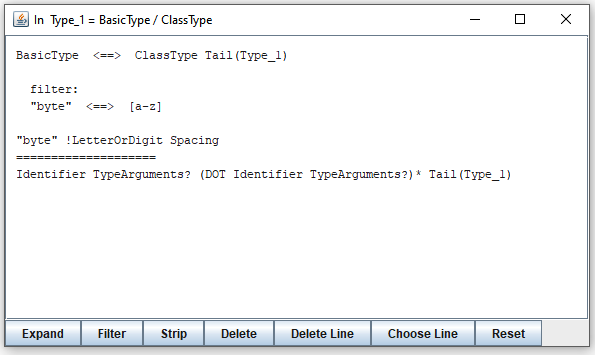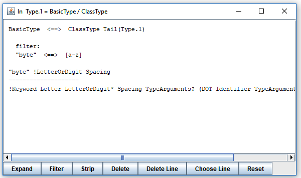 Clearly, the second line can not define a prefix of the bottom expression, so this alternative can be ignored in further exploration. By clicking the "Filter" button, you remove alternatives with first terminals disjoint with first terminals of all strings represented by expressions on the other side of "========". The result is as follows: